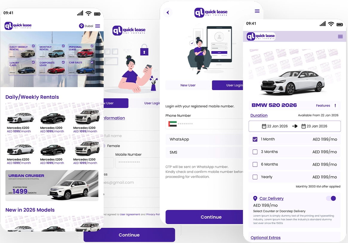 Quick lease Car Rentals is a mid-to-large company in the Dubai area that provides automotive and car rental services. It owns a huge inventory of vehicles; including economy cars and SUVs to luxury, and caters to individual customers and corporate drivers. The main services offered are self-drive and chauffeur-driven services, long-term corporate rentals, and value-added services like child seats, GPS as well as insurance upgrades.